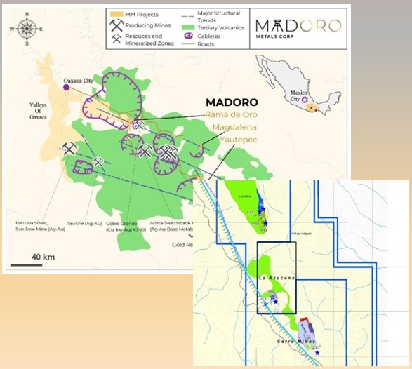 The Cerro Minas Property lies within the Oaxaca epithermal Au-Ag belt, approximately 130 kilometers southeast of Oaxaca City, and 30 kilometers southeast of Gold Resource Corporation’s (NYSE American: GORO) operating Arista-Switchback mine. The Property is an inlier to the Yautepec Project concession and covers 5 kilometers strike length of highly prospective ground along a northwest trending caldera structural margin. In addition, the Property contains polymetallic skarn-style mineralization (Ag-Au-Cu-Pb-Zn) that is the subject of historical reports by the Mexican Consejo de Recursos Minerales which documents small-scale artisanal mining.